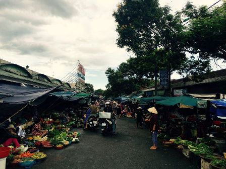 Markt in Hue, der alten Kaiserstadt und Hauptstadt Vietnams bis 1945. Hue liegt am Huong-Fluss, auch "Parfüm-Fluss" genannt. Zu den bedeutendsten Sehenswürdigkeiten zählen der Kaiserpalast und die Zitadelle der Verbotenen Stadt, die seit 1993 zum UNESCO-Weltkulturerbe gehört. Nördlich der Stadt verlief außerdem die Grenze zwischen dem einst gespaltenen Land. Im Norden befand sich das kommunistisch geprägte Vietnam, während der Westen (insbesondere die USA) den demokratischen Süden unterstützte.