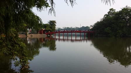 Die The-Huc-Brücke im Zentrum Hanois am Hoan-Kiem-See. Die Brücke verbindet das Festland der Stadt und den Jadeberg-Tempel. Im Volksmund nennt man sie auch "Rote Brücke der aufgehenden Sonne". Hanoi bietet im Zentrum einige Möglichkeiten, um Ruhe vom hektischen Stadtleben zu finden. Auffällig: In der ganzen Stadt stehen noch viele französische Villen aus der Kolonialzeit, die im Süden des Landes fast 100 Jahre herrschte.