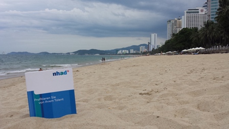 Am Sandstrand von Nha Trang, dem touristischen Zentrum Vietnams. Mein NHAD-Ordner kam natürlich mit auf die Reise und schmückt mehrere Bilder dieses Reiseberichts.